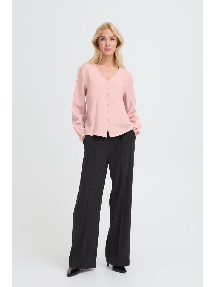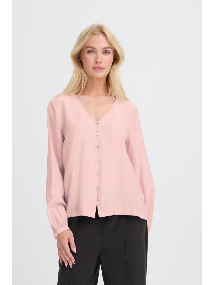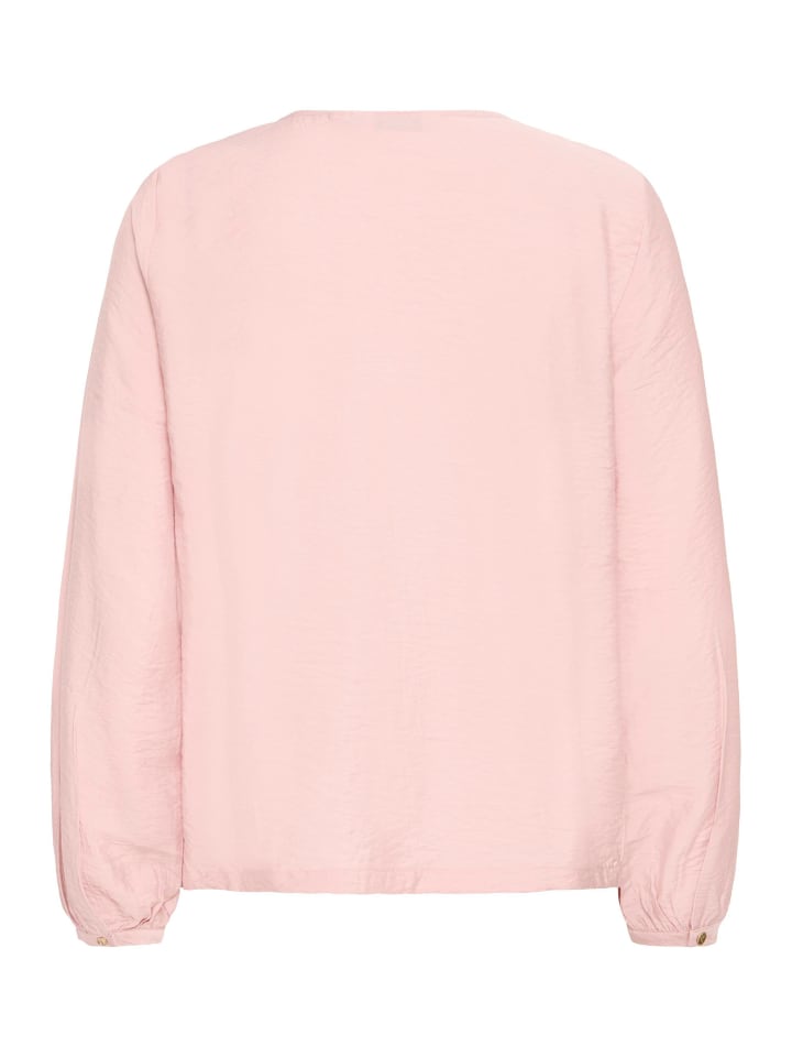 Эта блузка с длинными рукавами прямого силуэта, легкая и гладкая. V-образный вырез переходит в планку с пуговицами. Свободный крой, манжеты рукавов на резинке.