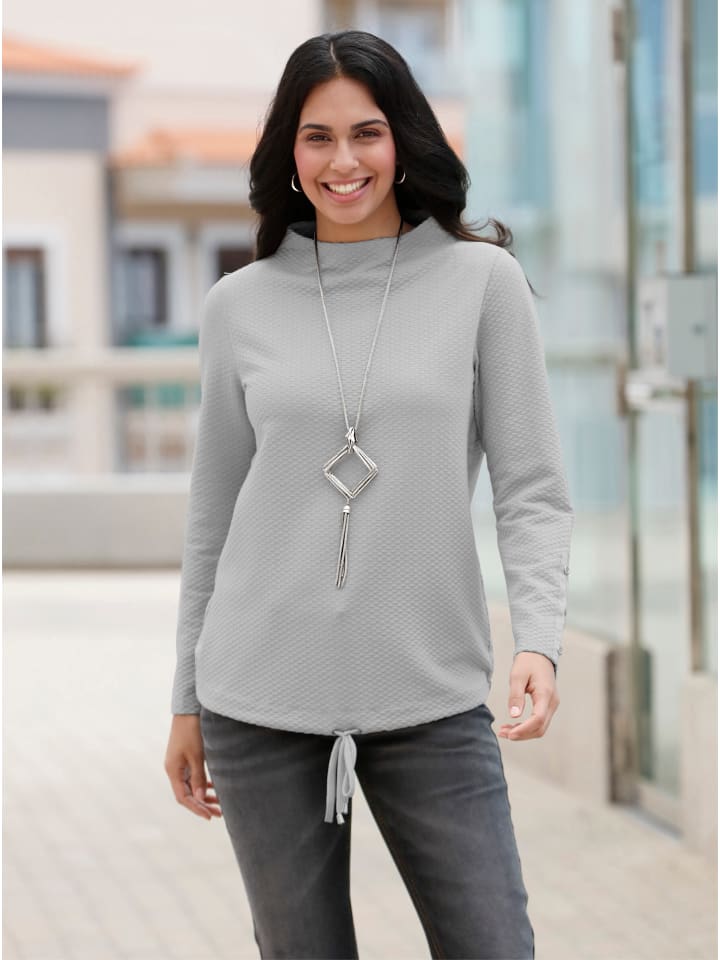 Рубашка из качественного жаккарда с современной вафельной текстурой. Модный крой с воротником-стойкой. Блестящие акценты создают накладная резинка на длинных рукавах с декоративными пуговицами и по боковым швам. Ширину подола можно регулировать с помощью кулиски с завязкой.