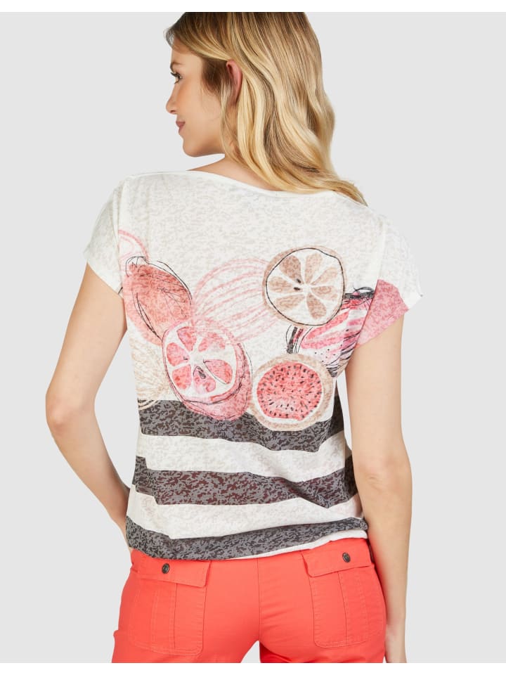 Эта модная рубашка Burnout привнесет летнюю свежесть в ваш гардероб. Светло-коралловый оттенок и фруктовый принт в сочетании со сверкающими стразами делают эту рубашку по-настоящему притягивающей взгляды. Спущенные плечи придают верху непринужденный, расслабленный вид, а эластичный подол обеспечивает выгодную посадку. Удобная смесь полиэстера и вискозы удивительно легкая и идеально подходит для теплых дней. При длине сзади около 64 см в размере 38, рубашка идеально сидит на уровне бедер.