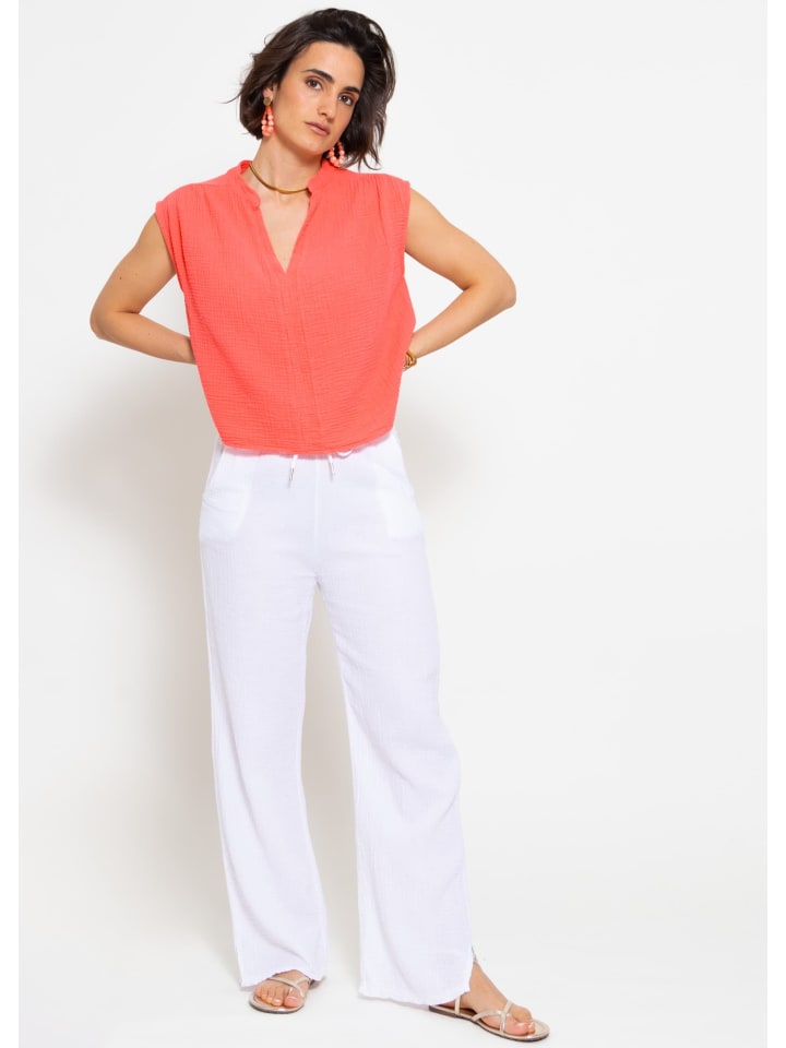 Эта муслиновая рубашка впечатляет своей сдержанной элегантностью и характерной фактурой муслиновой ткани. V-образный вырез слегка подчеркивает зону декольте, а безрукавка с небольшим прикрытием на плечах обеспечивает летнюю легкость. Свободный силуэт и слегка удлиненный сзади подол позволяют рубашке красиво драпироваться и выгодно подчеркивать фигуру. Типичная морщинистая текстура муслина подчеркивает его непринужденный характер и обеспечивает легкое, воздушное ощущение. Закругленный подол позволяет дизайну гармонично вписываться в самые разные наряды. В сочетании с шортами, юбками или брюками эта рубашка станет универсальным компаньоном для теплых дней и одинаково хорошо впишется как в непринужденные образы для отдыха и отпуска, так и в уютную домашнюю одежду.