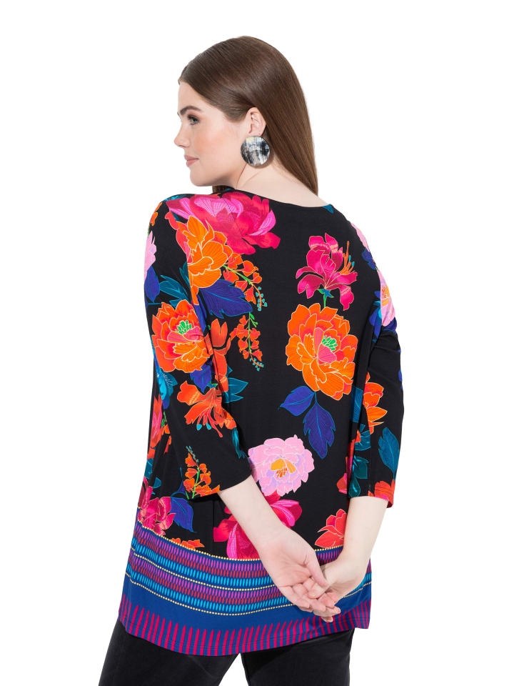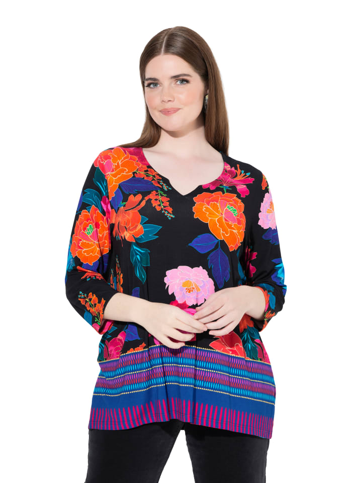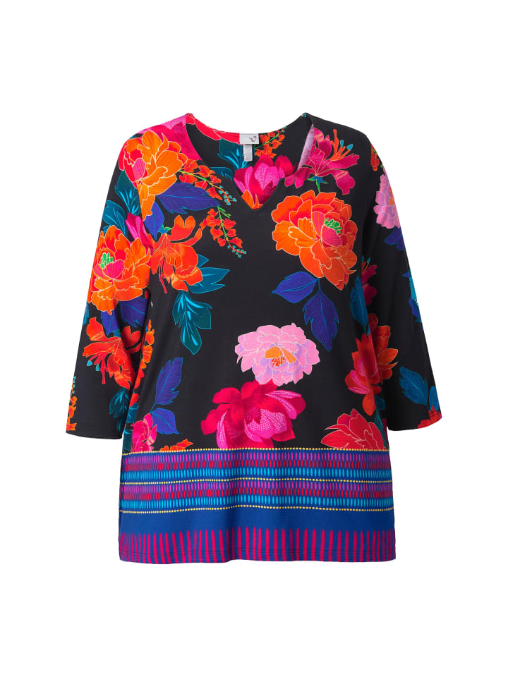 Футболка А-силуэта с принтом в деревенском стиле. Вырез горловины - туника, рукава 3/4.