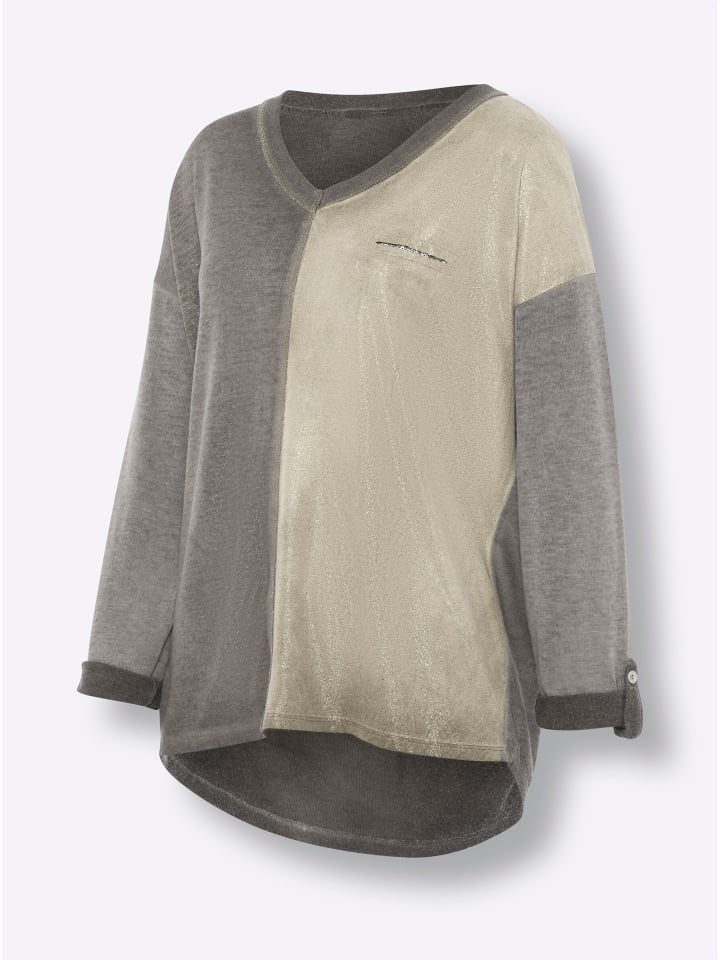 Рубашка в модном масляном стиле с мерцающим золотым эффектом. V-образный вырез и ложный нагрудный карман с пайетками. Длинные рукава, которые можно подвернуть с помощью хлястика и пуговицы. Немного длиннее сзади.