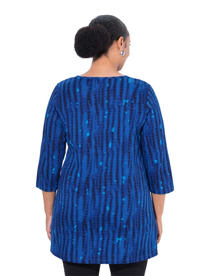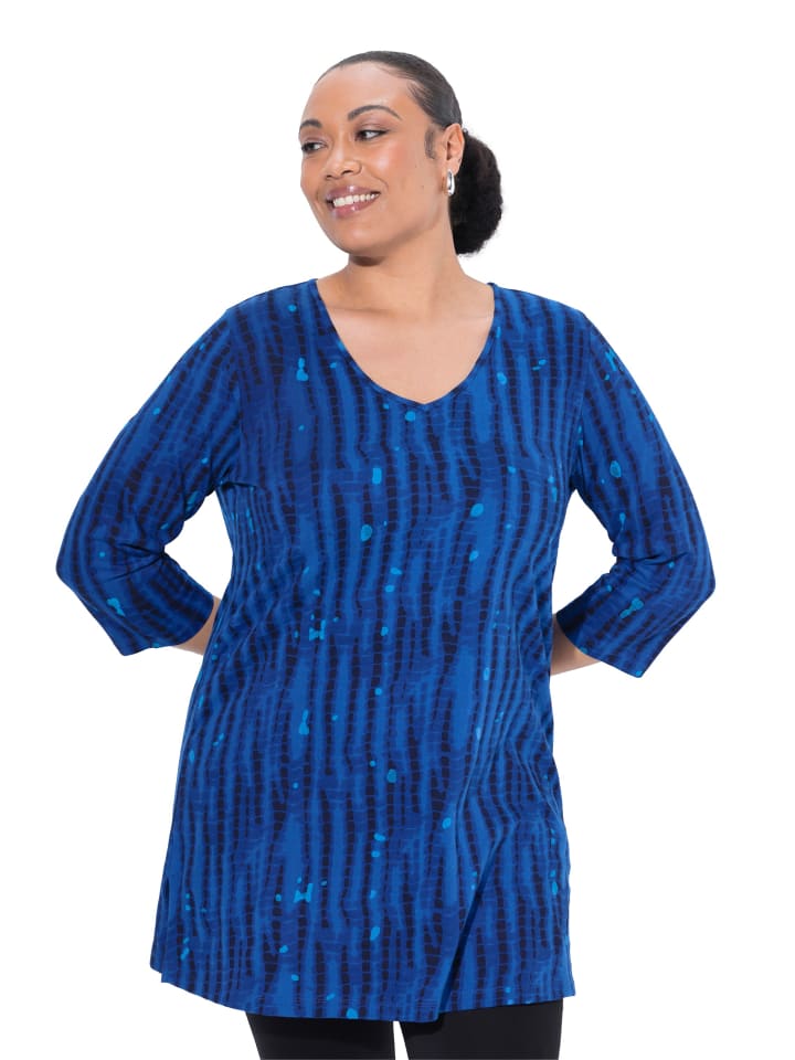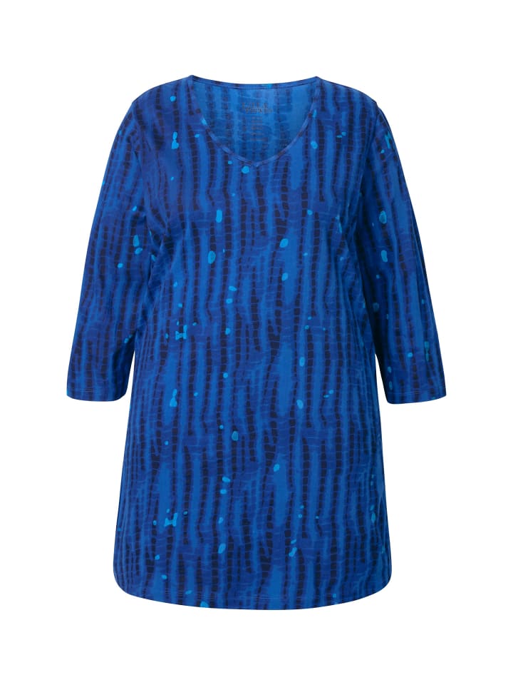 Рубашка А-силуэта с длинными рукавами из мягкого трикотажа с рисунком в стиле батик. V-образный вырез, рукава 3/4. Удобный широкий подол с боковыми разрезами для дополнительного комфорта.