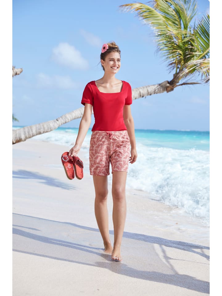 Футболка с квадратным вырезом и широким вырезом. Изготовлена из приятной на ощупь тонкой трикотажной ткани в рубчик. Облегающий крой.