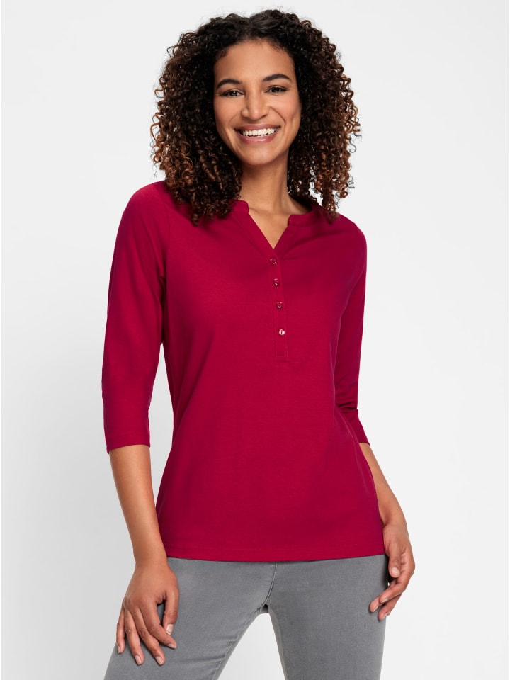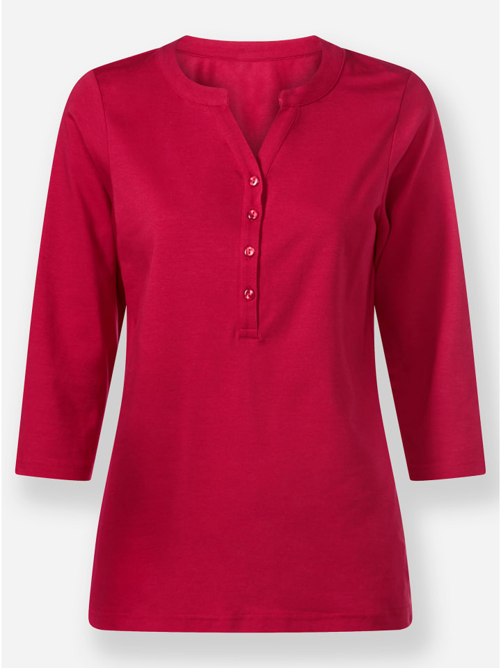 Абсолютно в тренде и невероятно удобно: рубашка с рукавами 3/4, круглым вырезом, открытым V-образным вырезом и короткой планкой на пуговицах. Сертифицировано GOTS.