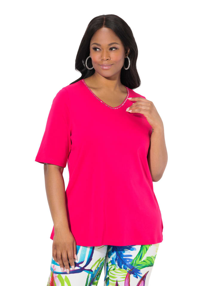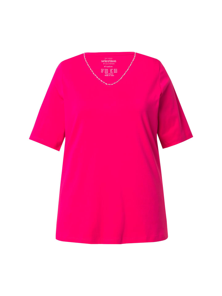 Футболка А-силуэта из высококачественного мягкого хлопка. Эта особенно мягкая и приятная на ощупь футболка украшена элегантной блестящей отделкой на V-образном вырезе. Длинные короткие рукава.