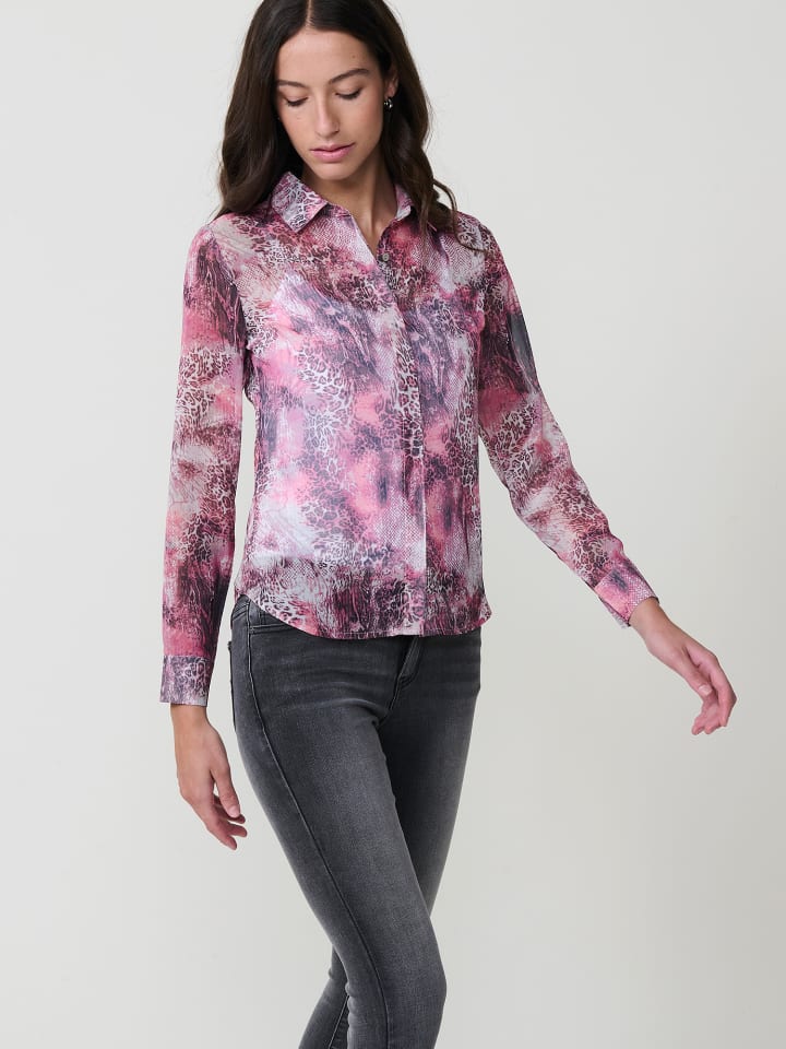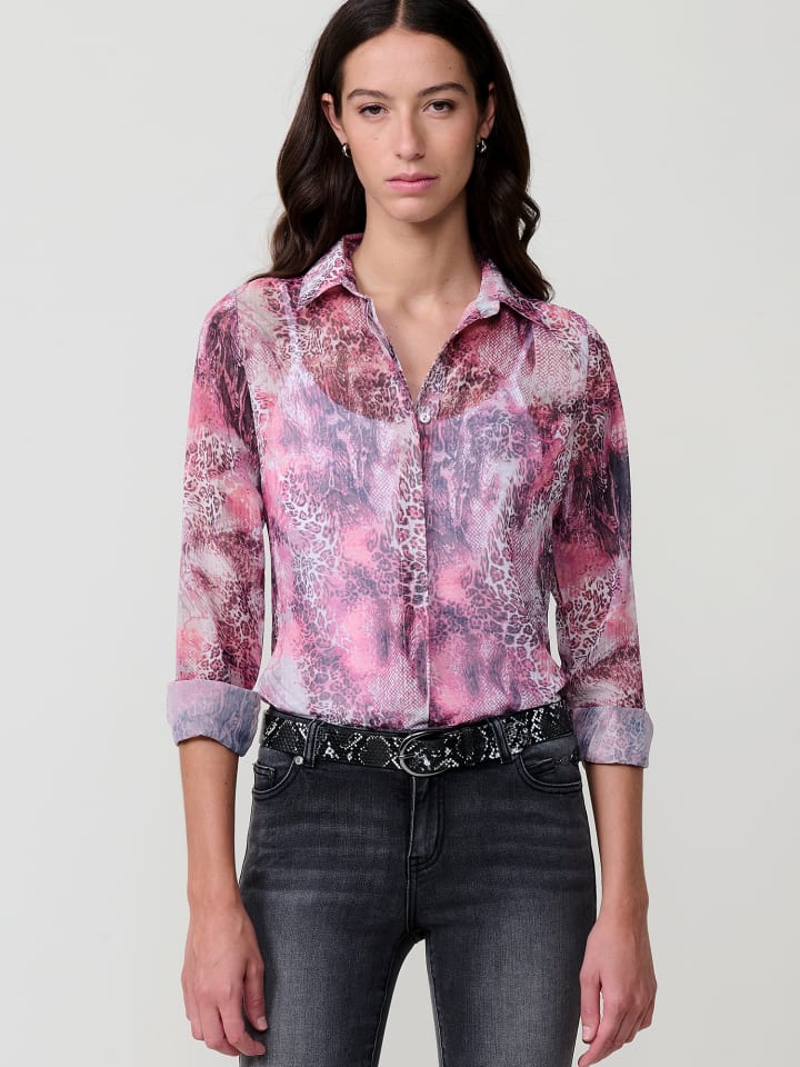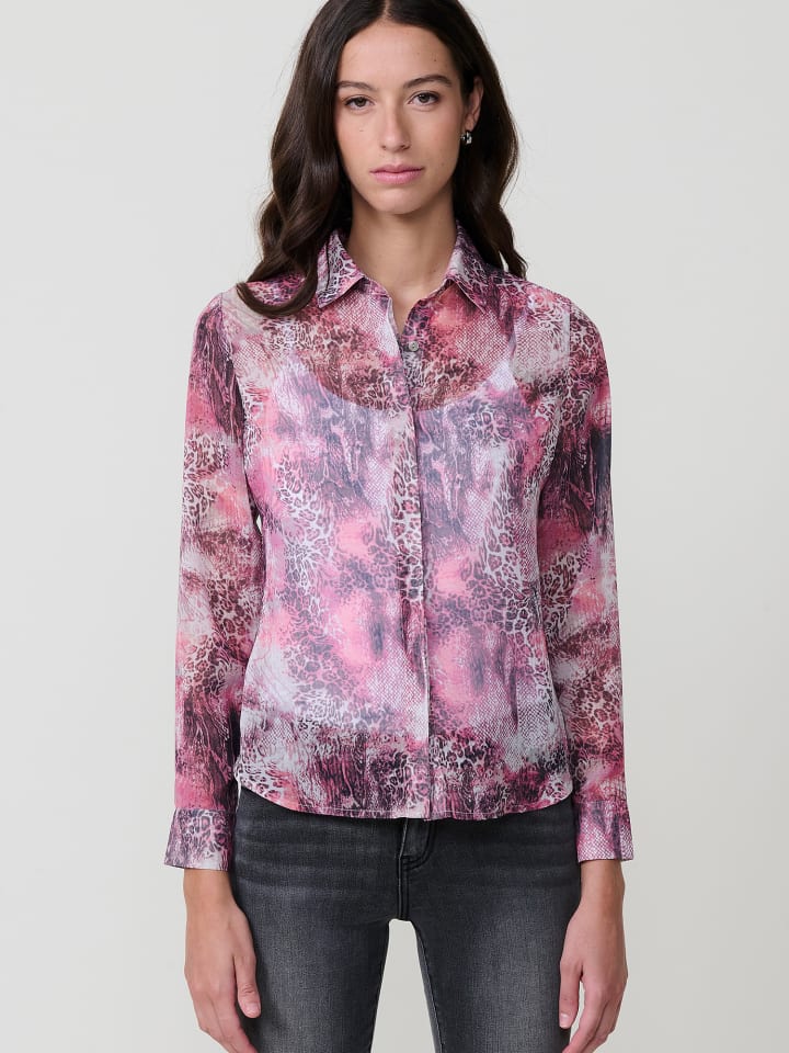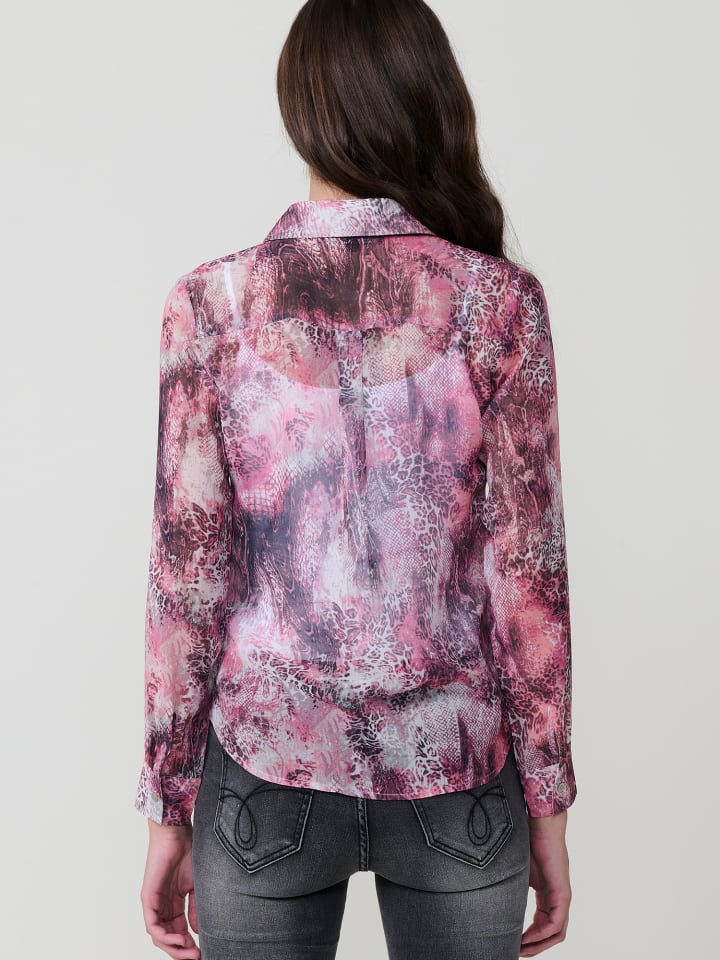 Прозрачная шифоновая блузка с анималистичным принтом. Отложной воротник и длинные рукава с манжетами на пуговицах. Застежка спереди на потайные пуговицы. Металлическая пластинка с логотипом Koroshi на подоле. Состав: 100% полиэстер.