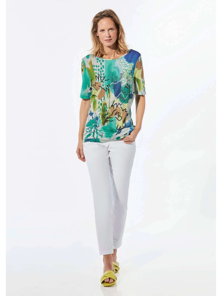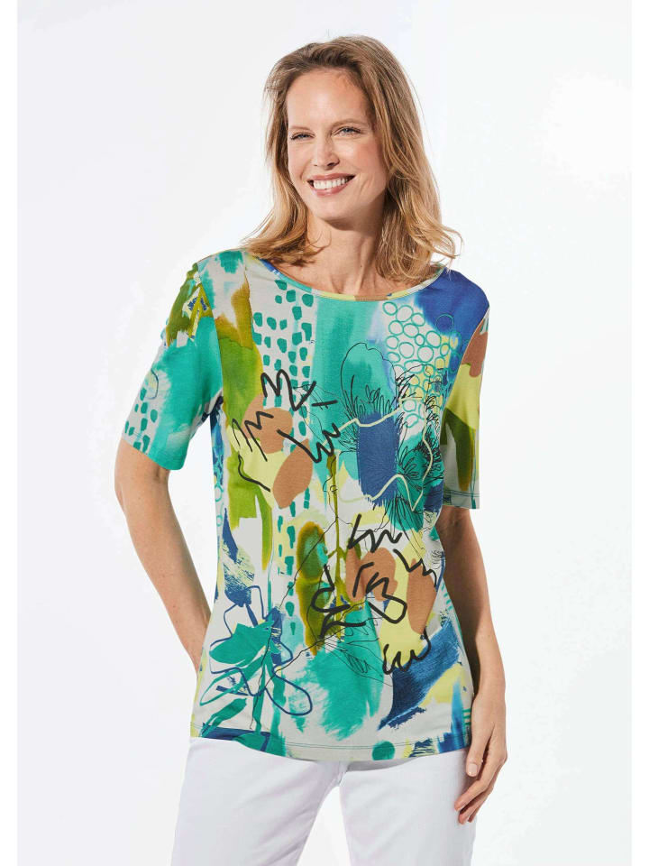 Рубашка с узким вырезом «лодочка», элегантно дополненная основной тканью. Яркий принт по всей поверхности придает рубашке живой вид. Длина до бедер обеспечивает современный крой и делает ее универсальной для создания стильных образов. Изготовленная из высококачественного вискозного трикотажа с добавлением эластичности, рубашка обеспечивает комфорт и оптимальную свободу движений. Длина: около 64 см для размера 46, около 60 см для размера 23.
