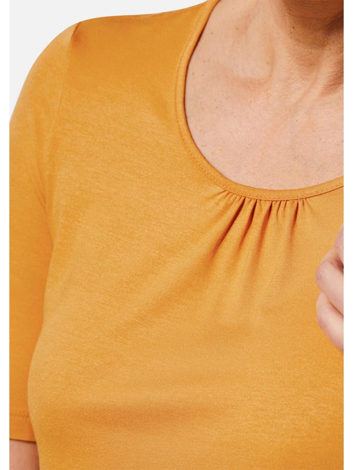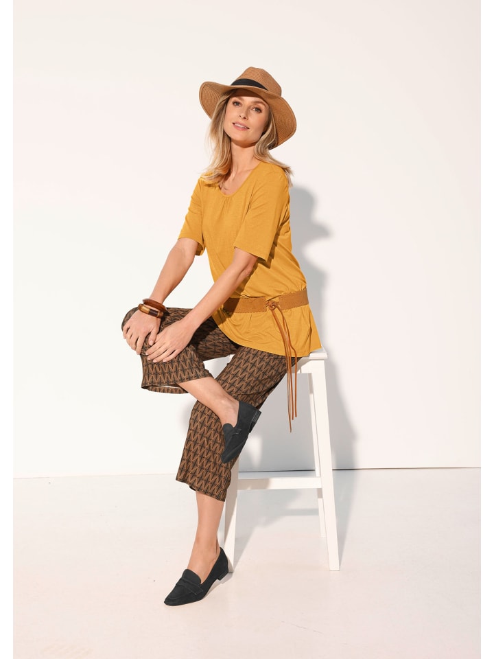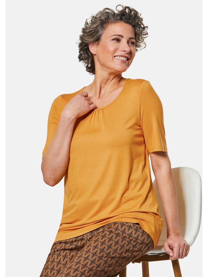 Рубашка прекрасных цветов для создания новых и освежающих образов. Непринужденный, слегка расклешенный крой дополнен женственной сборкой по круглому вырезу. Воздушные, легкие, удлиненные рукава до середины бедра и подол до бедер обеспечивают комфортную посадку. Изготовлена из мягкой вискозы с эластаном. Длина: около 73 см для размера 46, около 69 см для размера 23.