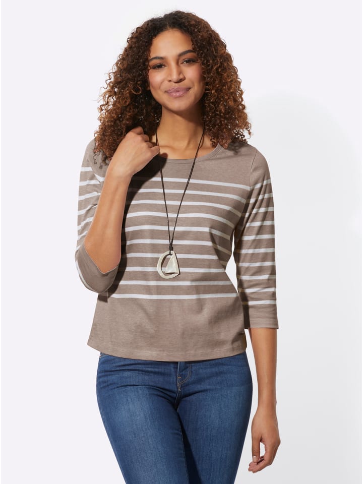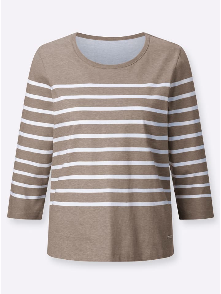 Простая в уходе и очень удобная: полосатая рубашка с принтом. Круглый вырез горловины и рукава 3/4. Удобный одинарный трикотаж. Изделие сертифицировано GOTS.