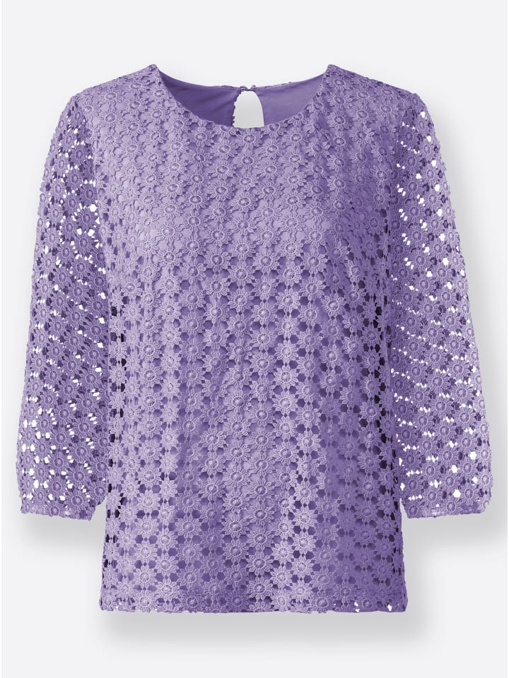 Эта рубашка очаровывает своим современным, приятным и мягким цветочным кружевом! Подкладка из комфортного трикотажа, прозрачными остаются только рукава 3/4 с эластичными манжетами! Круглый вырез горловины с разрезом и застежкой на петлю сзади. Вытачки на груди.