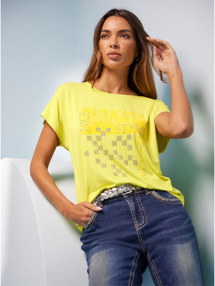 Рубашка: Мягкая, струящаяся, приятная для кожи вискоза с модным принтом и сверкающими стразами. Круглый вырез, спущенная линия плеча и короткие рукава.