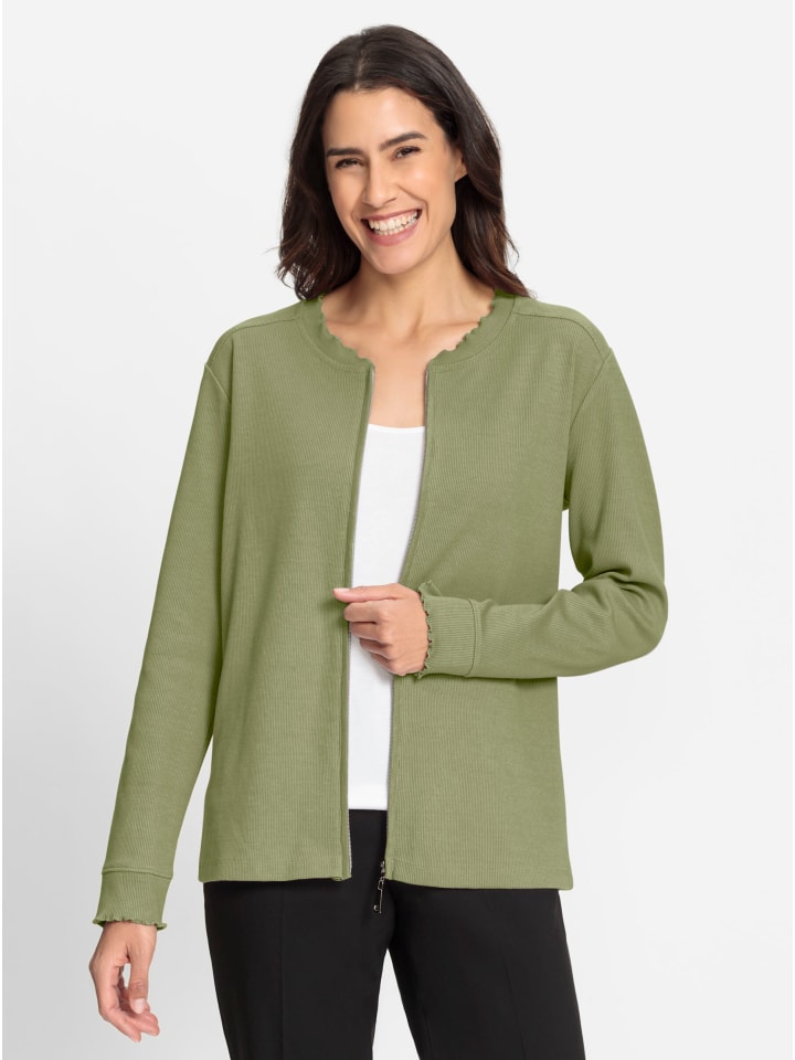 Универсальная ребристая куртка-рубашка с застежкой-молнией. Изюминкой является фестончатая отделка круглого выреза и манжет. Длинные рукава. Сертифицировано OCS, изготовлено из органического хлопка.