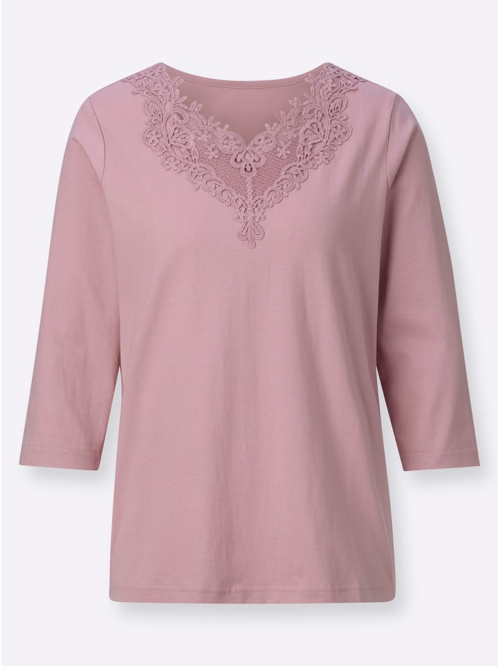 Но, пожалуйста, с кружевом! Вы просто не сможете оторваться от прекрасной декоративной детали, украшающей вырез этой рубашки с рукавом 3/4.