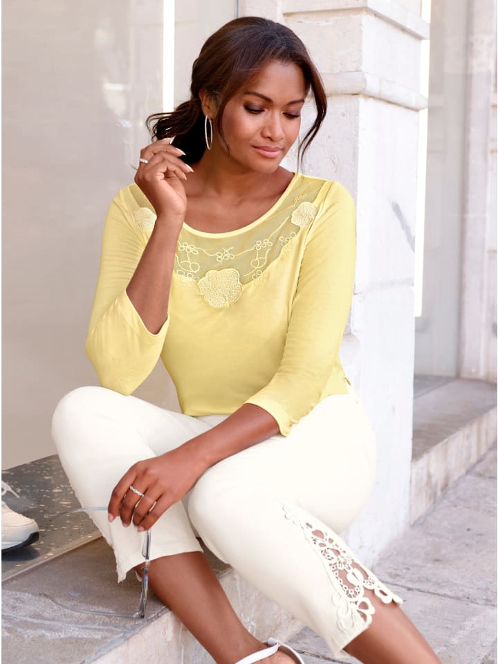 Какая прелесть! Рубашка с модным широким круглым вырезом, слегка прозрачной сетчатой вставкой и элегантной кружевной отделкой. Рукава 3/4. Мягкая, струящаяся ткань.