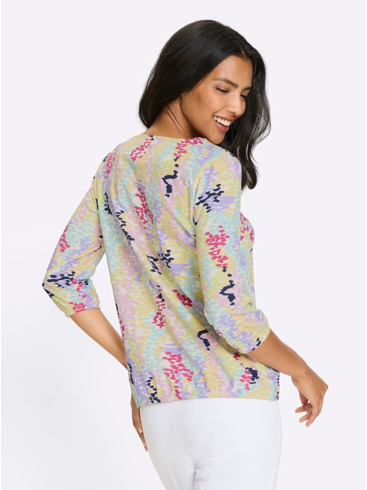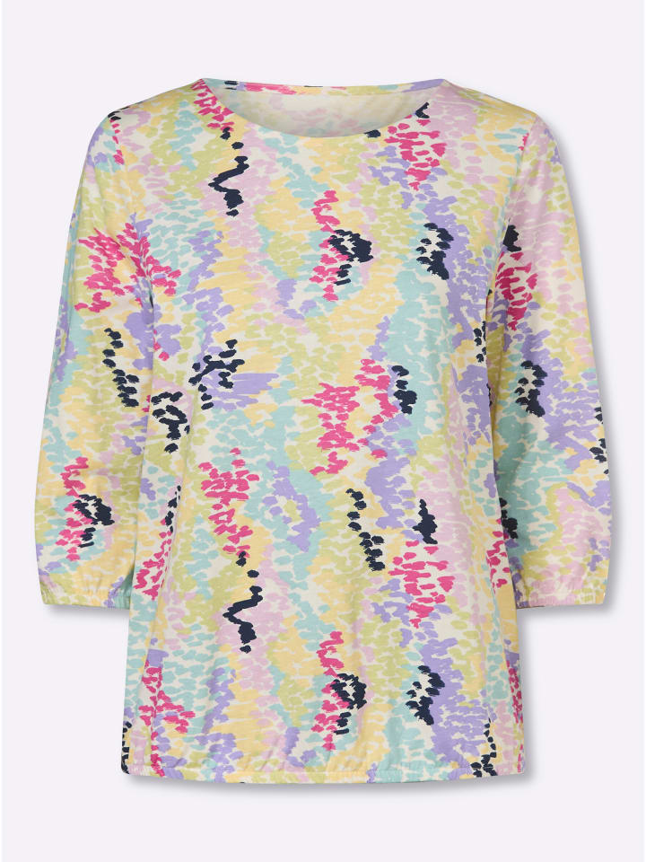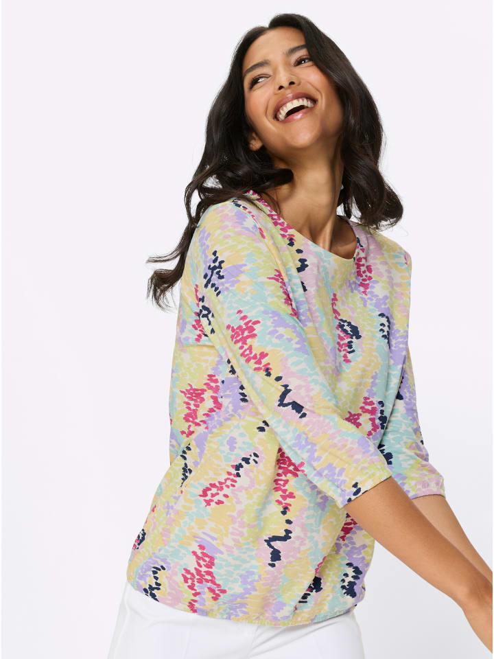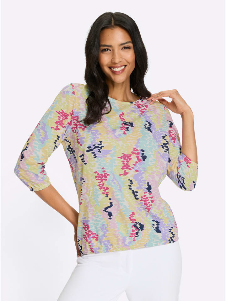 Хорошее настроение, которое можно носить! Рубашка с рукавами 3/4 и свежим принтом в горошек. Круглый вырез, эластичные манжеты и подол.