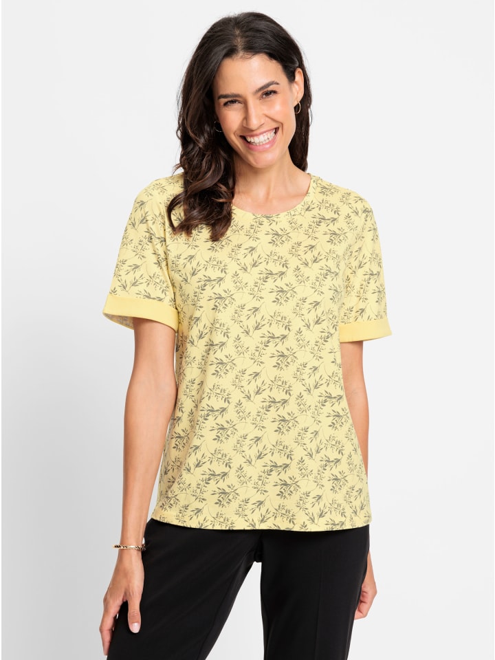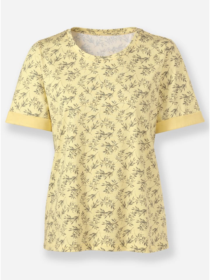 Невероятно универсальная рубашка с принтом и красивым цветочным рисунком. Круглый вырез горловины и короткие рукава с декоративной пришитой однотонной манжетой. Сертифицировано OCS.