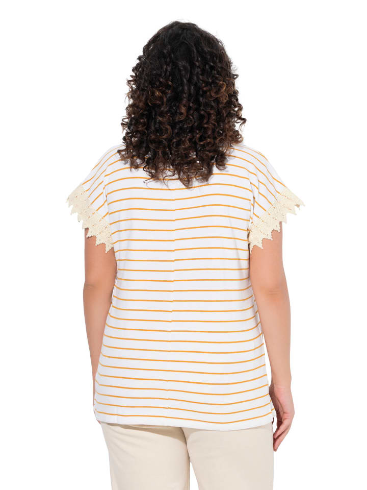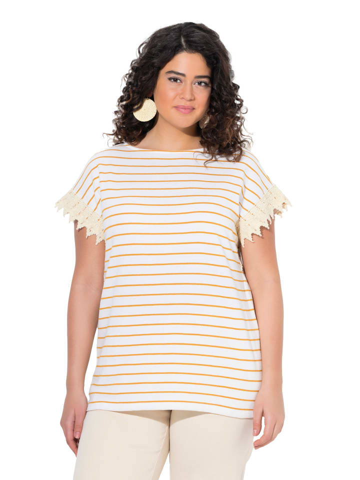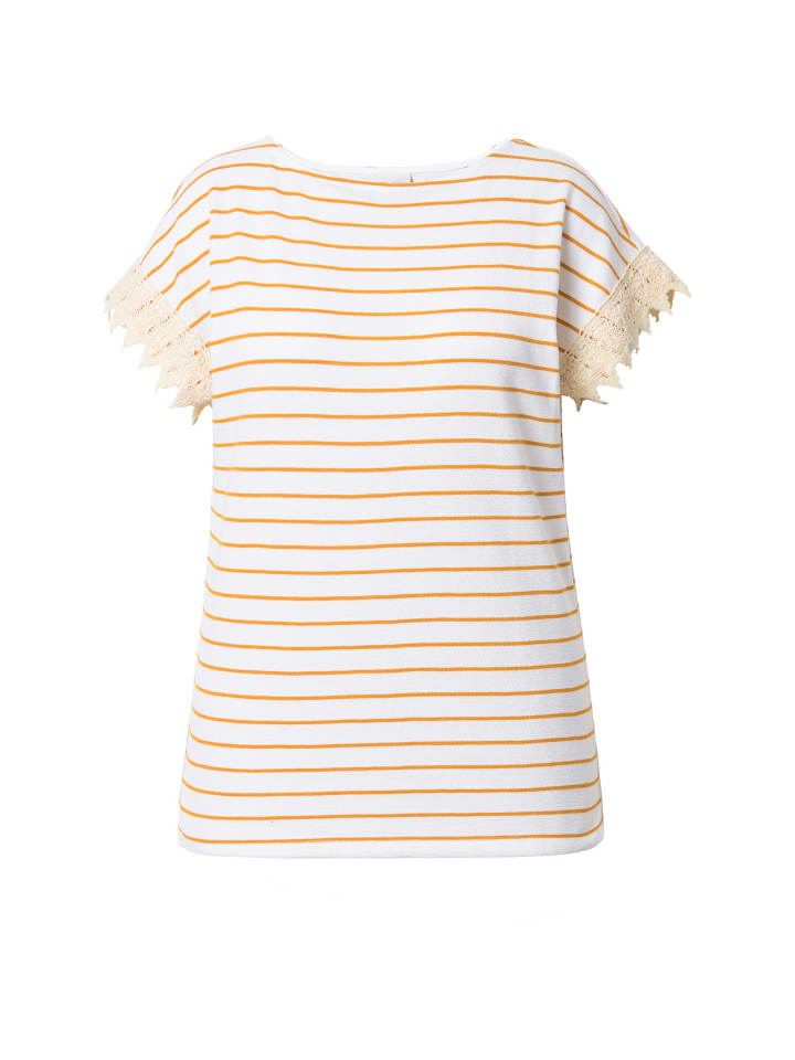Полосатая рубашка из органического хлопка с отделкой изящным хлопковым кружевом на спущенных плечах. Свободный крой с вырезом-лодочкой и боковыми разрезами для дополнительного комфорта. Органический; сертифицирован ECOCERT Greenlife, номер лицензии: 152026.