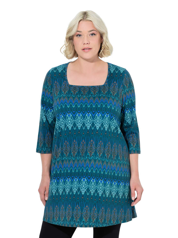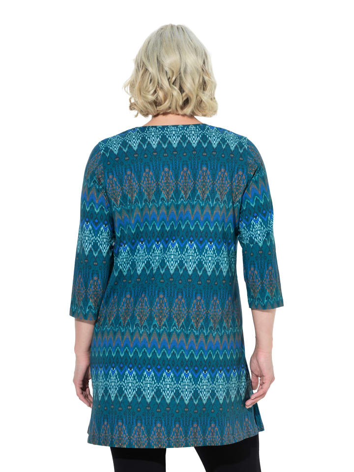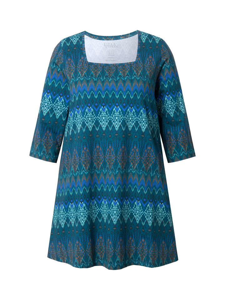 Рубашка А-силуэта с длинными рукавами и узором. Квадратный вырез, рукава 3/4. Удобный широкий подол с боковыми разрезами.