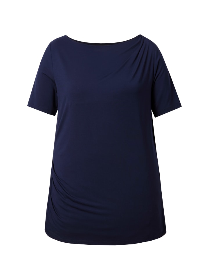 Футболка классического кроя из мягкого трикотажа с женственной драпировкой на плечах. Вырез горловины «лодочка», короткие рукава.