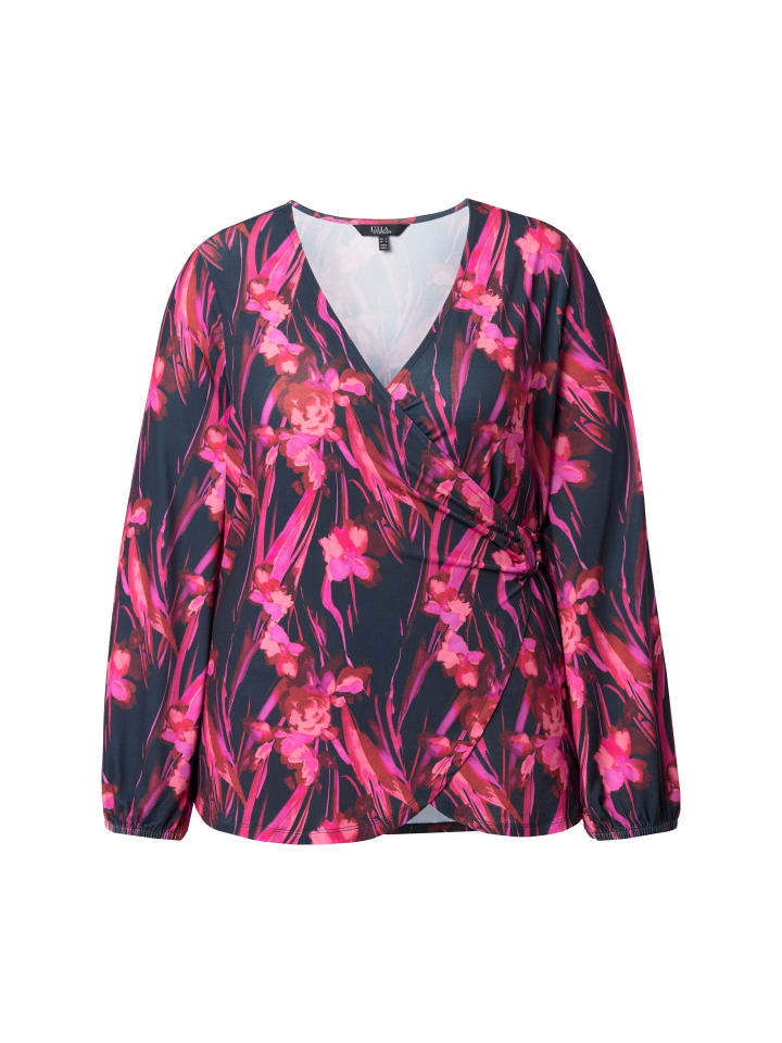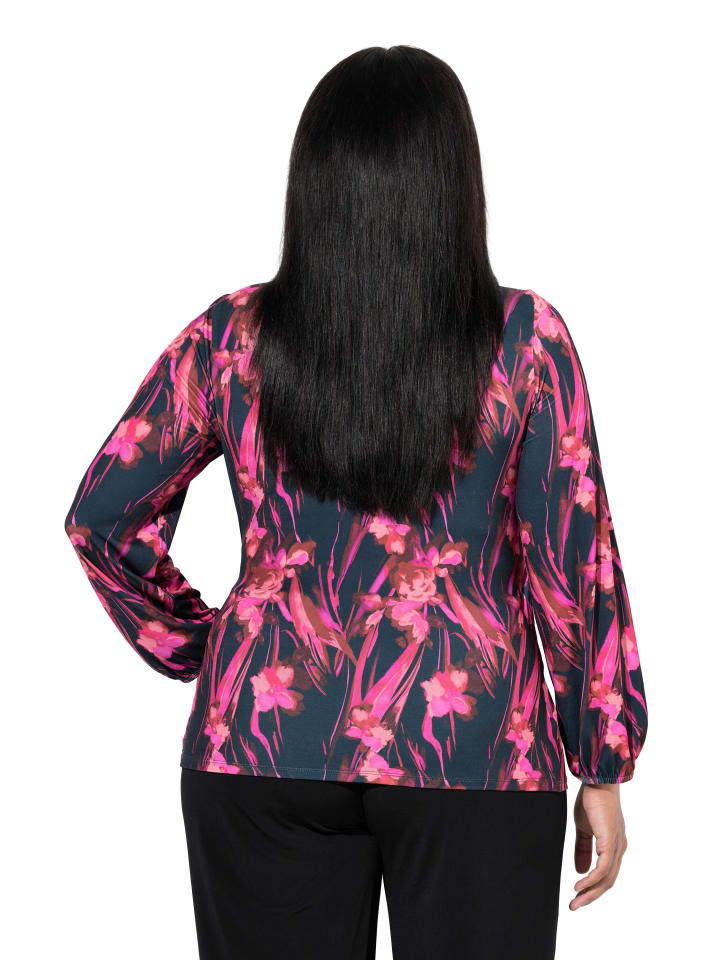 Рубашка с длинными рукавами, удобная, облегающая, из приятного эластичного трикотажа, фасона «запах», с цветочным принтом по всей поверхности. V-образный вырез, драпировка на талии декоративным кольцом, длинные рукава с эластичными манжетами.