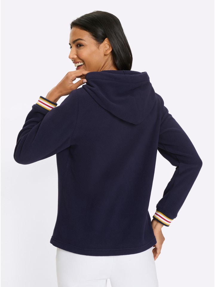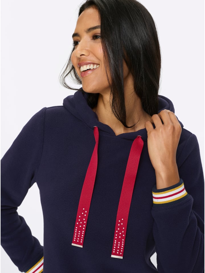 Пушистая, еще пушистее, флисовая! Эта флисовая рубашка легко надевается - идеально подходит для прохладных дней. Длинные рукава украшены полосатыми ребристыми манжетами и золотистыми блестками. Капюшон затягивается шнурком, люверсами и завязывается с помощью сверкающих страз. Антипиллинговая обработка предотвращает образование катышков.