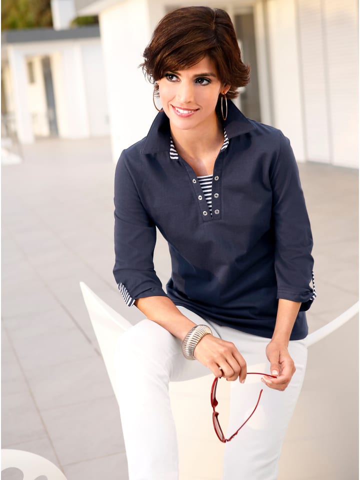 Спортивная рубашка с контрастными полосками на воротнике, вставкой «2 в 1» и закатанными рукавами 3/4. Отделка люверсами на вырезе и манжетах рукавов добавляет дополнительный декоративный штрих.