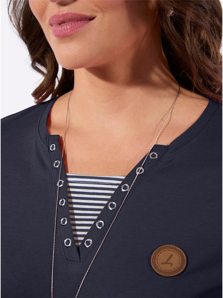 Образ 2-в-1: суперспортивный. Смесь хлопка и модала: невероятно удобно носить. Рубашка с круглым вырезом и V-образным вырезом, украшенная люверсами и полосатой вставкой. Современные рукава 3/4 и прямой подол. Сертифицировано OCS.