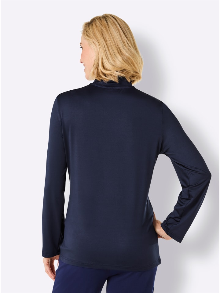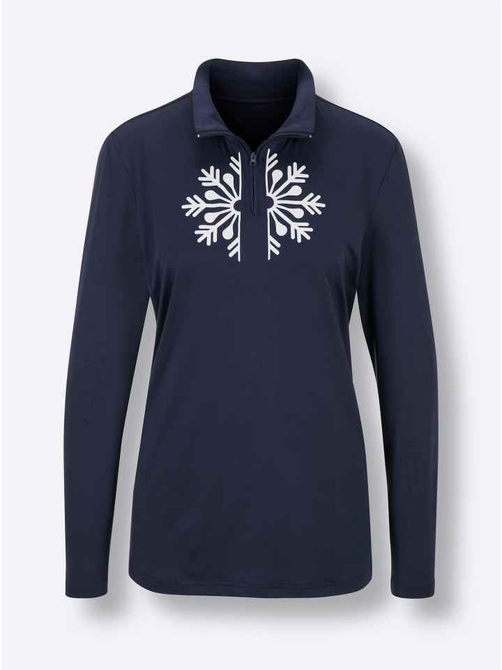 Простая в уходе функциональная рубашка с воротником-стойкой и потайной молнией - идеально подходит в качестве базового слоя, так как дышащая и быстросохнущая. Декоративный принт в виде снежинок спереди. Очень комфортная благодаря эластичной ткани.