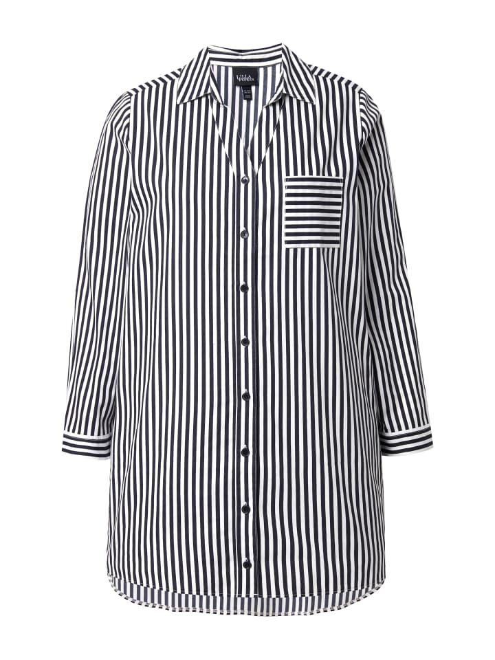 Блузка-рубашка, удлиненный А-силуэт, из мягкого хлопка с полосками и нагрудным карманом. Отложной воротник, застежка на пуговицы по всей длине, длинные рукава с манжетами. Удлиненный подол сзади с боковыми разрезами для дополнительного комфорта.