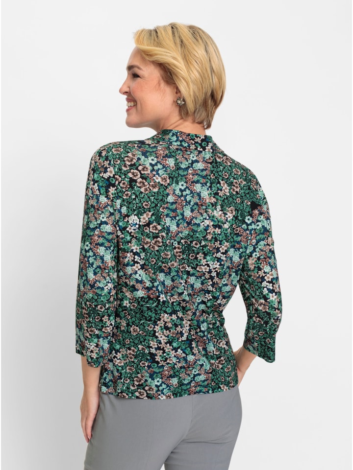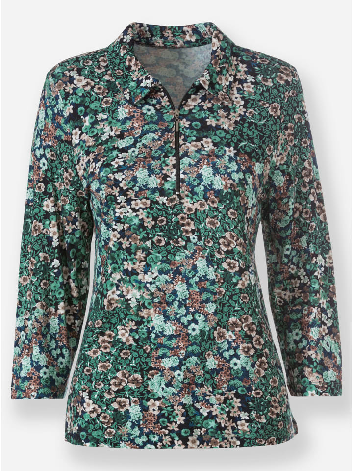 Благодаря красивому цветочному узору эта рубашка-поло невероятно универсальна! Воротник-поло с короткой молнией. Рукава длиной 3/4. Эластичная ткань.