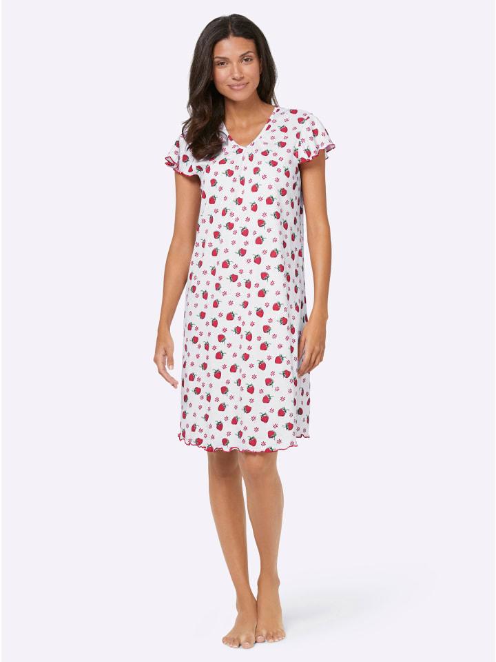 Какая прелесть! Ночная рубашка с игривым принтом. Изящные сборки на V-образном вырезе с окантовкой. Рукава-крылышки с контрастной декоративной строчкой. Волнистый край. Изготовлено из однотонного трикотажа.