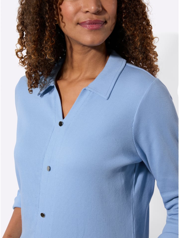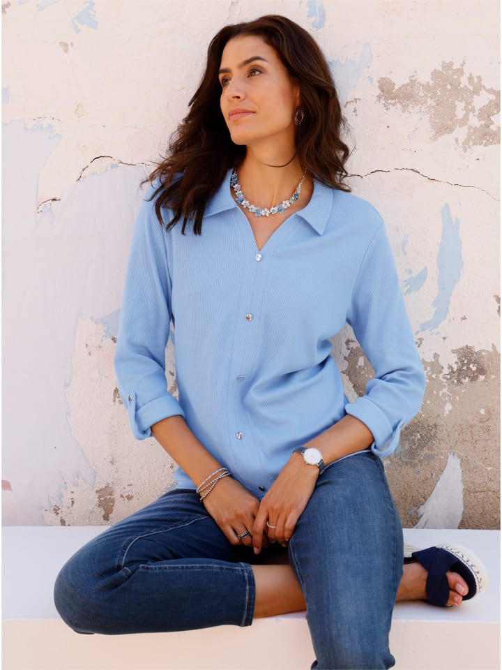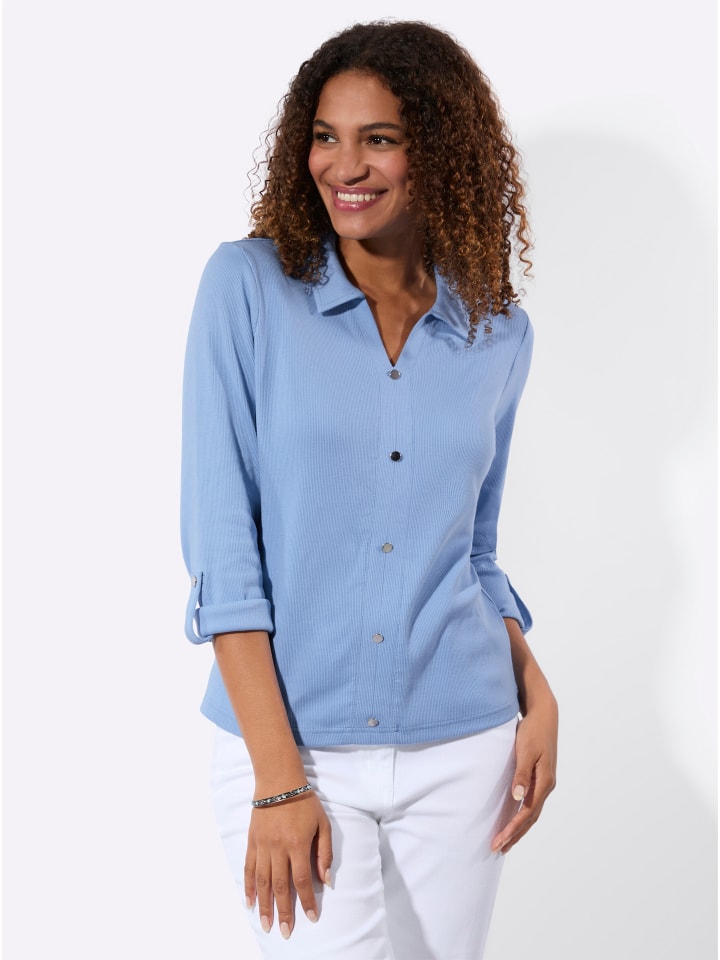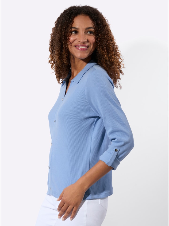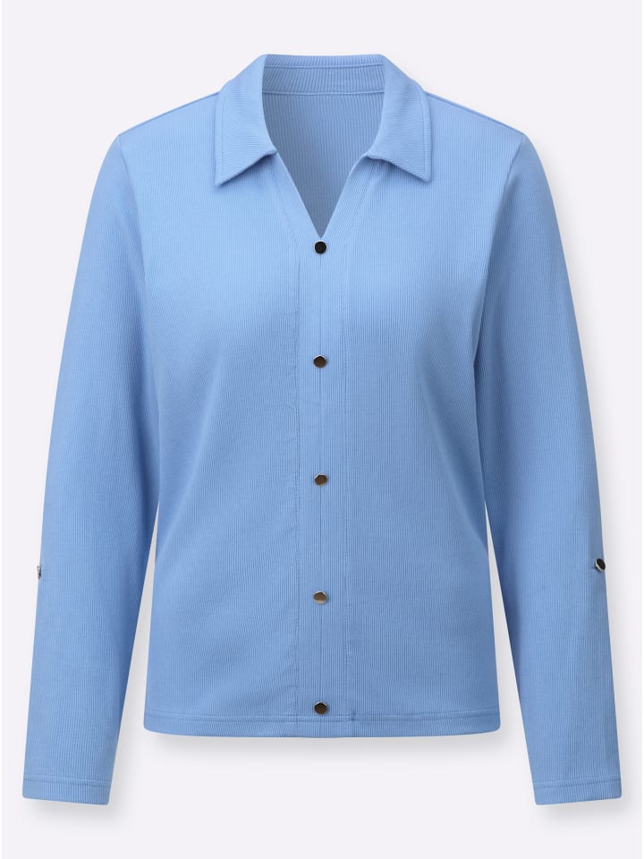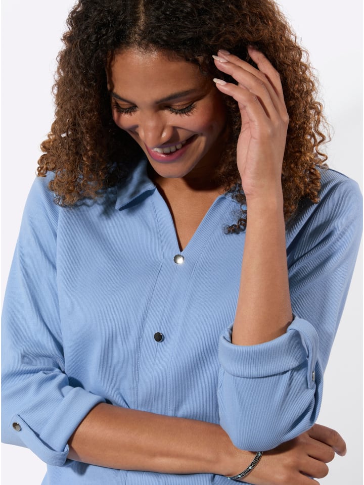 Модная рубашка с воротником-поло, открытым V-образным вырезом и декоративной планкой с пуговицами по всей длине. Длинные рукава, которые можно подвернуть до длины в три четверти и закрепить хлястиком и пуговицой. Удобна в носке.