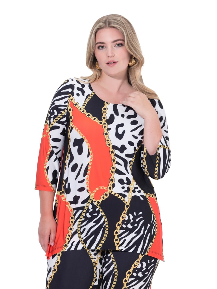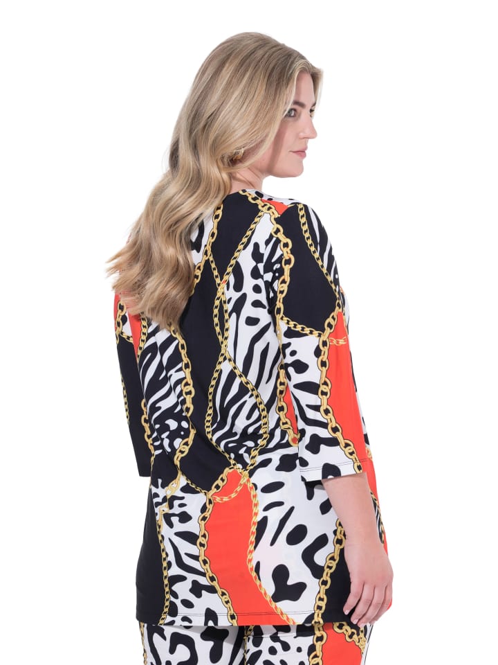 Футболка А-силуэта из приятного на ощупь эластичного трикотажа с графическим принтом. Круглый вырез горловины, рукава 3/4, боковые разрезы.