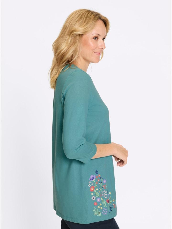 Доступная рубашка с длинными рукавами, удлиненным V-образным вырезом и красивым, стратегически расположенным принтом из красочных цветочных мотивов на плечах и подоле. Удлиненный А-образный силуэт свободно драпируется и обеспечивает комфорт.