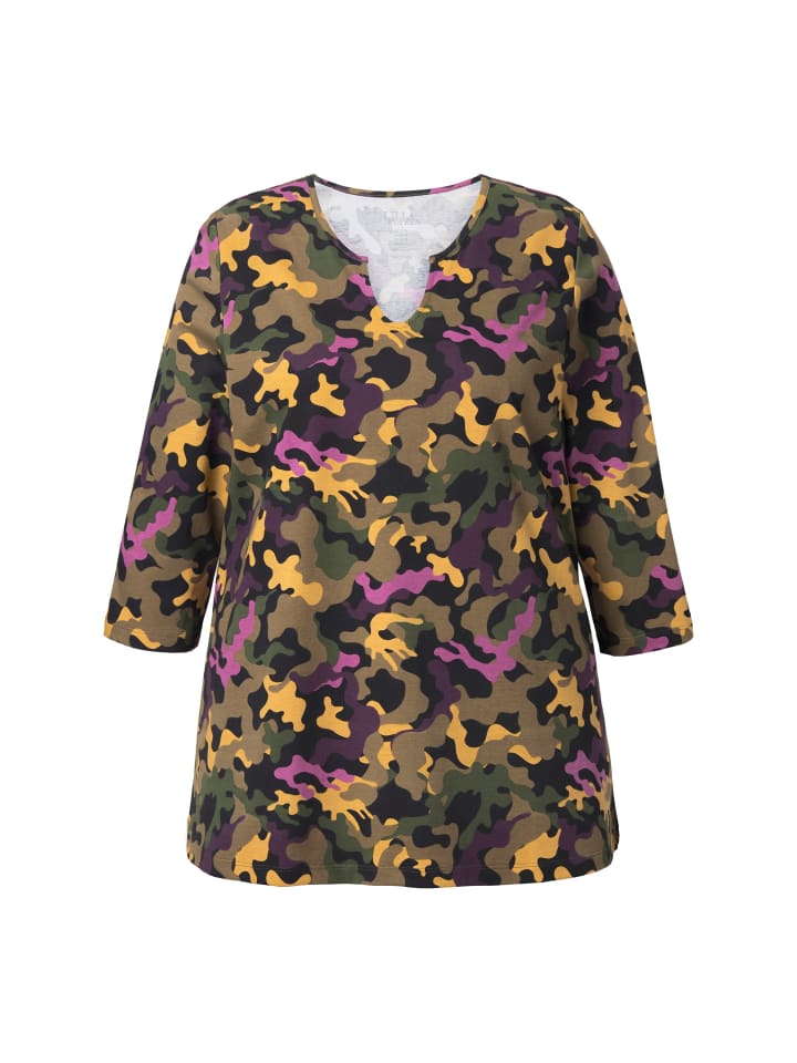 Футболка А-силуэта из мягкого трикотажа с рисунком. Вырез горловины туника, рукава 3/4. Удобный широкий подол.