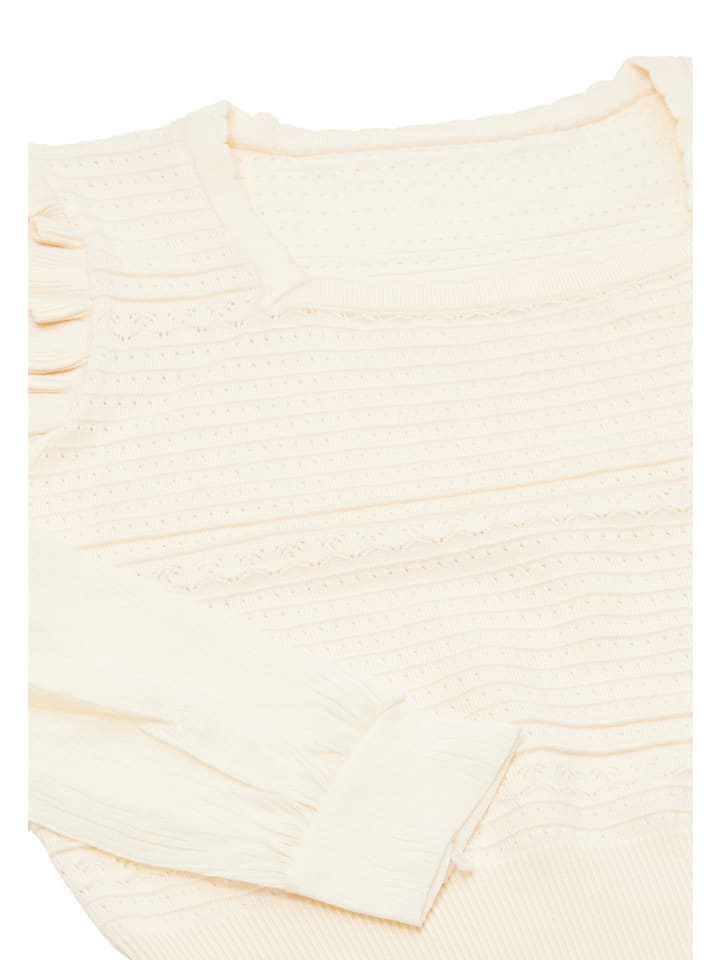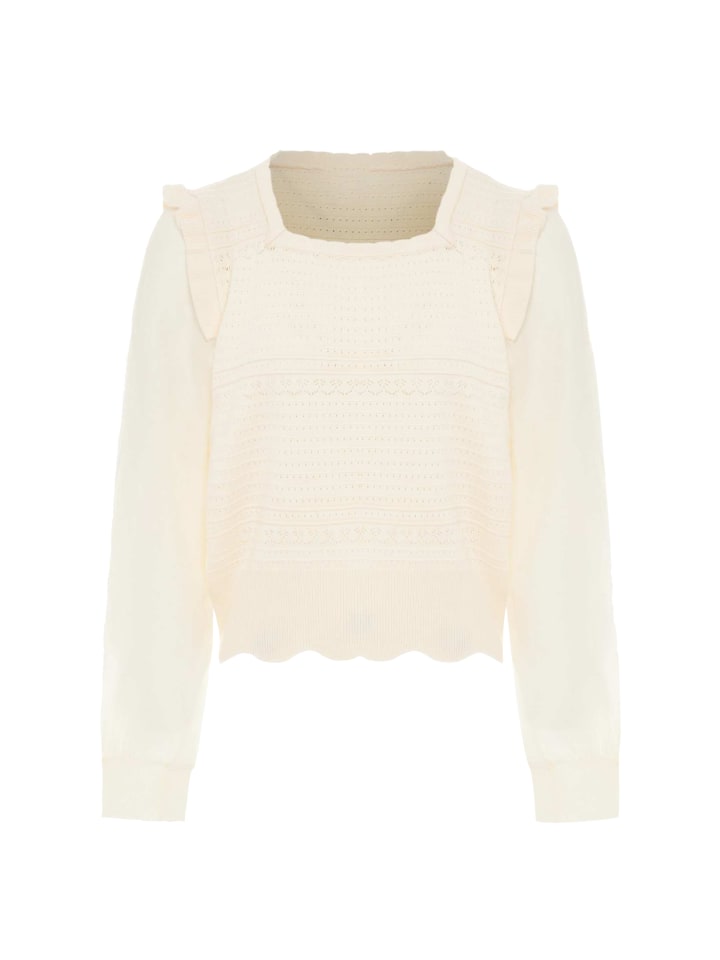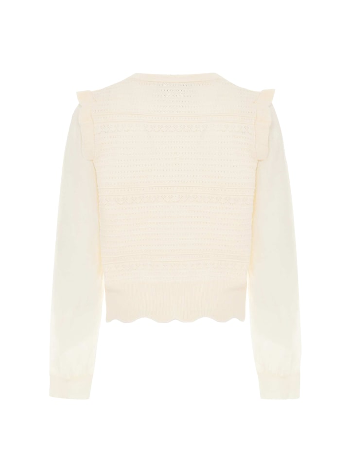 Откройте для себя стильную изюминку в этом укороченном свитере с длинными рукавами. Замысловатый узор из чередующихся полос и ажурной вязки, напоминающей кружево, добавляет изюминку. Круглый вырез горловины, ребристый подол и манжеты обеспечивают идеальную посадку, а слегка присборенные рукава создают мягкий женственный силуэт. Разработано совместно Faina и NAEMI.
