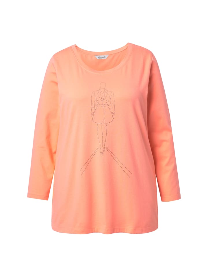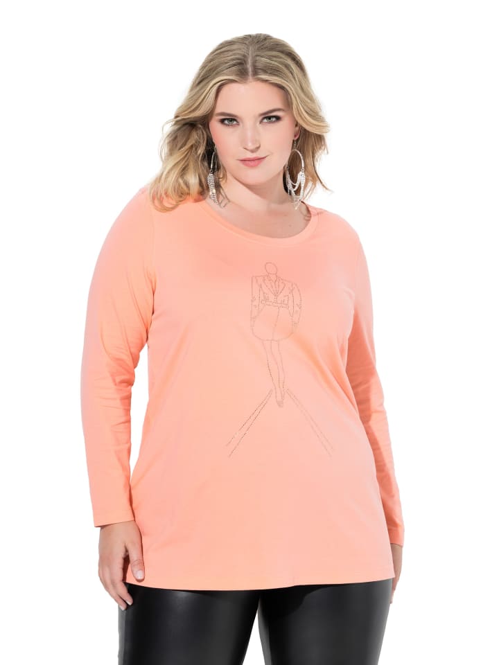 Футболка А-силуэта с рисунком модели, выполненным из стразов. Круглый вырез горловины, длинные рукава.