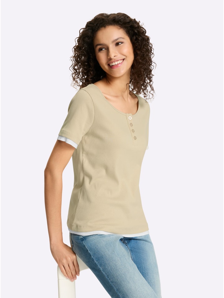 Мягкая, приятная на ощупь рубашка в рубчик, модный образ «два в одном». Круглый вырез горловины с планкой на пуговицах, короткие рукава. Сертифицировано GOTS.
