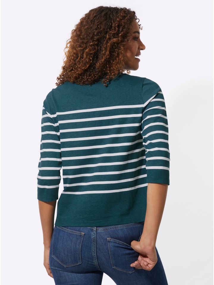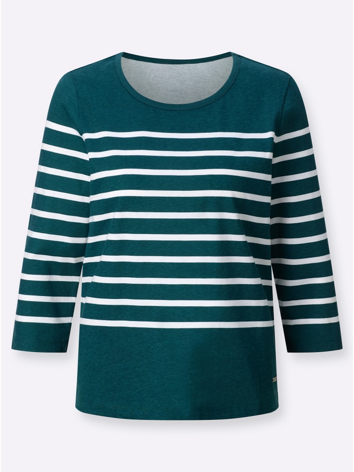 Простая в уходе и очень удобная: полосатая рубашка с принтом. Круглый вырез горловины и рукава 3/4. Удобный одинарный трикотаж. Изделие сертифицировано GOTS.