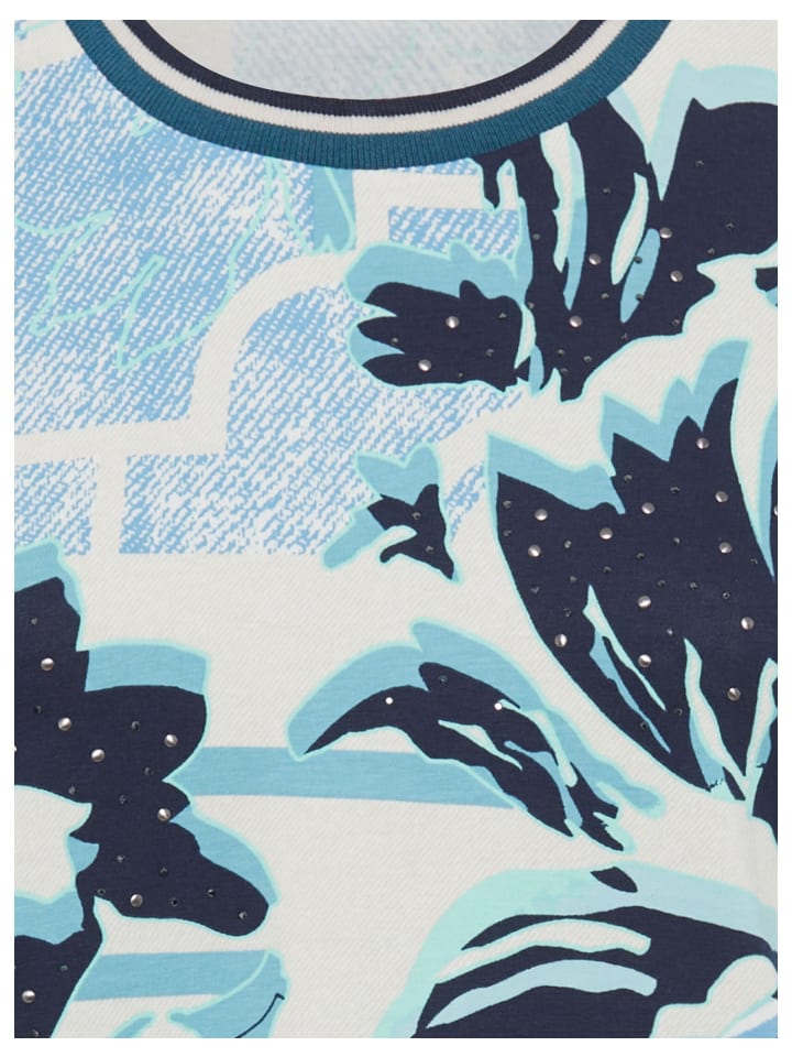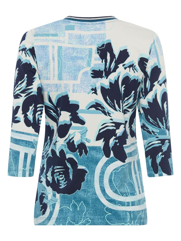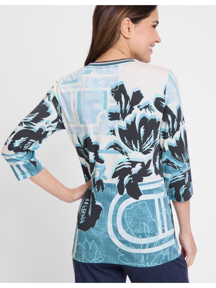 Цветочные элементы украшают принт на этой рубашке с круглым вырезом и рукавами три четверти. Рубашка выполнена из смеси хлопка и эластана для комфорта. Облегающий, прилегающий крой делает ее универсальной и потенциальной фавориткой вашего гардероба. Длина: около 62 см.