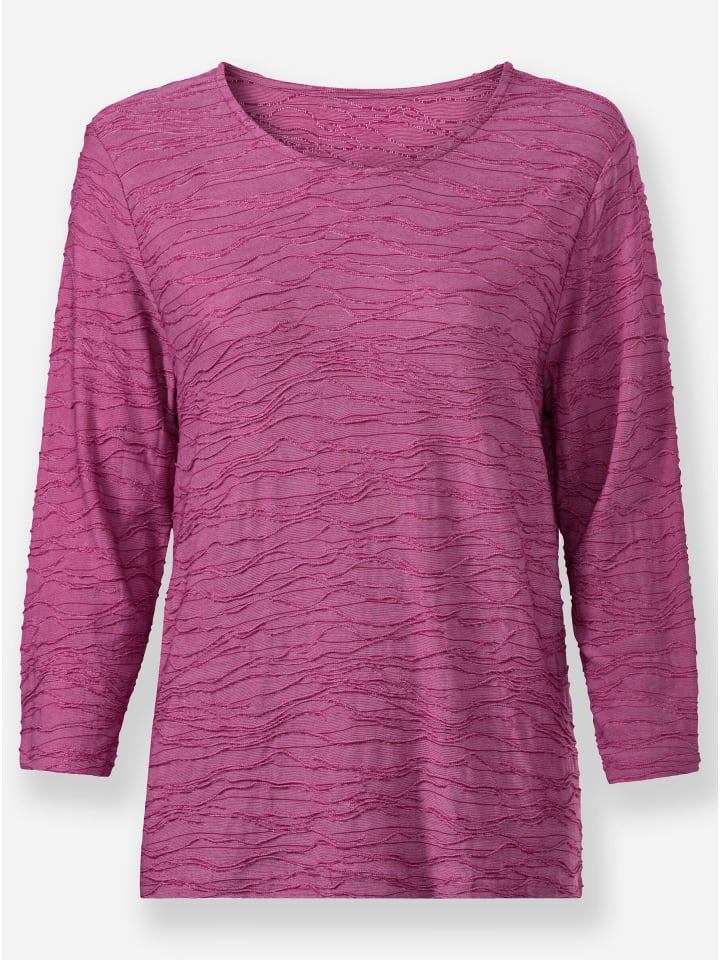Прекрасная рубашка с рукавами 3/4, не требующая особого ухода, из приятной меланжевой ткани с замысловатым жаккардовым узором в виде волн. Круглый вырез, рукава 3/4 и прямой подол.