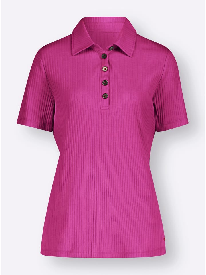 Рубашка-поло из красивого ребристого материала, невероятно удобная и приятная в носке благодаря эластичному материалу. С воротником-поло, короткой планкой на пуговицах и короткими рукавами. Боковые разрезы обеспечивают свободу движений.