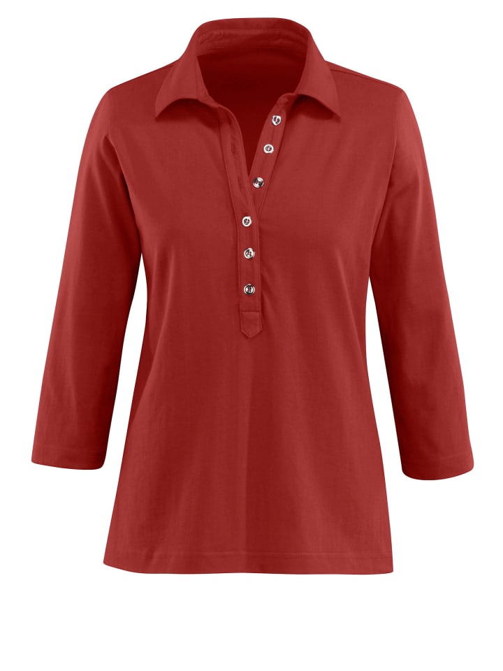 Мягкая качественная рубашка поло. Модная длинная планка с серебристыми пуговицами. Рукава 3/4. Продукт сертифицирован OCS.