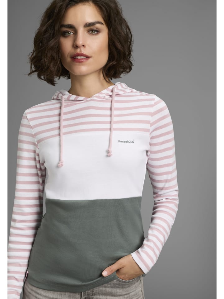 Простая женская рубашка с капюшоном от KangaROOS с эффектными цветовыми блоками. Приталенный крой до бедер и длинные рукава. Высокоэластичная рубчатая ткань адаптируется к форме тела.