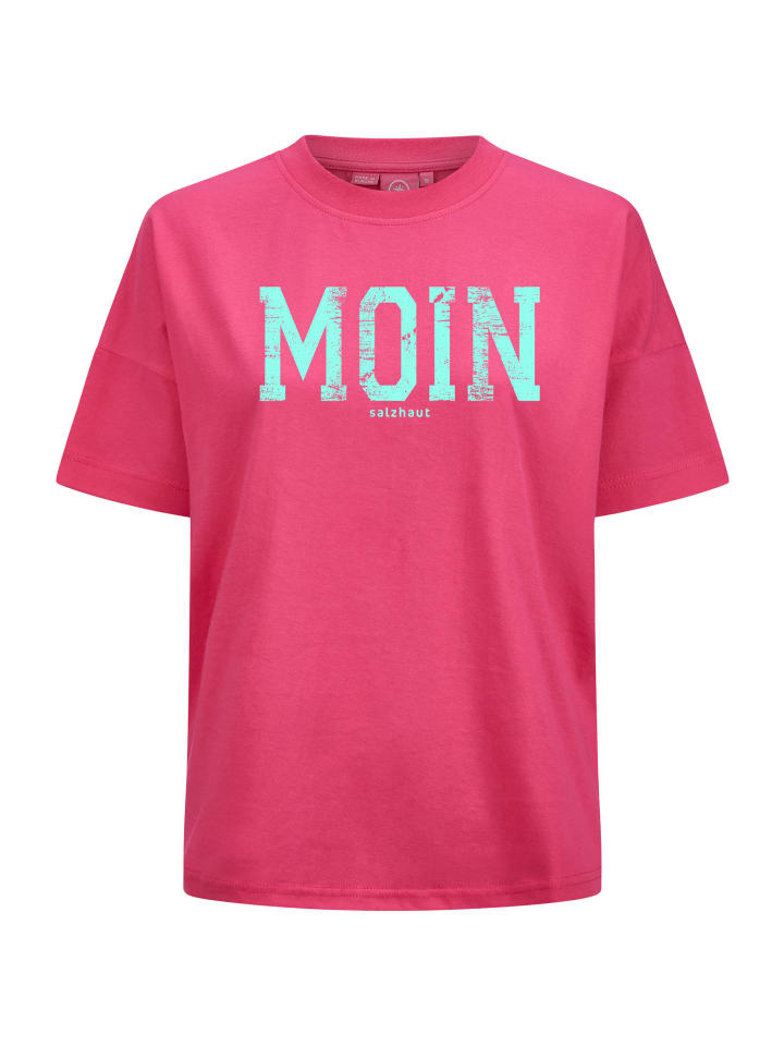 MOINI! Женская рубашка LEEV с короткими рукавами от Salzhaut - идеальный стильный аксессуар для тех, кому нужно немного бодрости в повседневной жизни! Модный трафаретный принт «MOIN» в прохладных тонах делает эту рубашку настоящей приманкой для глаз - настоящим воплощением позитивной энергии. Рубашка с короткими рукавами и спущенными плечами имеет очень удобный классический крой, а длина 65 см в размере M обеспечивает идеальный уровень стиля.