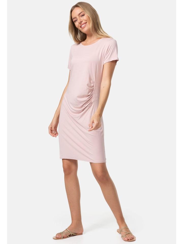 Это модное женское платье-рубашка отличается привлекающими внимание сборками на левой стороне. На талии чудесно мягкая ткань из 95% высококачественной вискозы собрана в складки пятью широкими вытачками. Эта привлекательная деталь умело привлекает внимание к этой области и выгодно подчеркивает фигуру. Свободный крой играет с этим элементом дизайна. Короткое летнее женское платье-рубашка имеет прямой, свободный крой, который удобно драпирует силуэт.