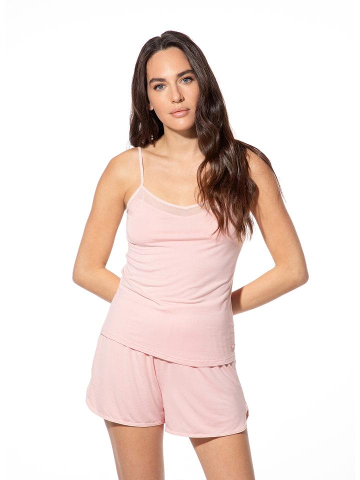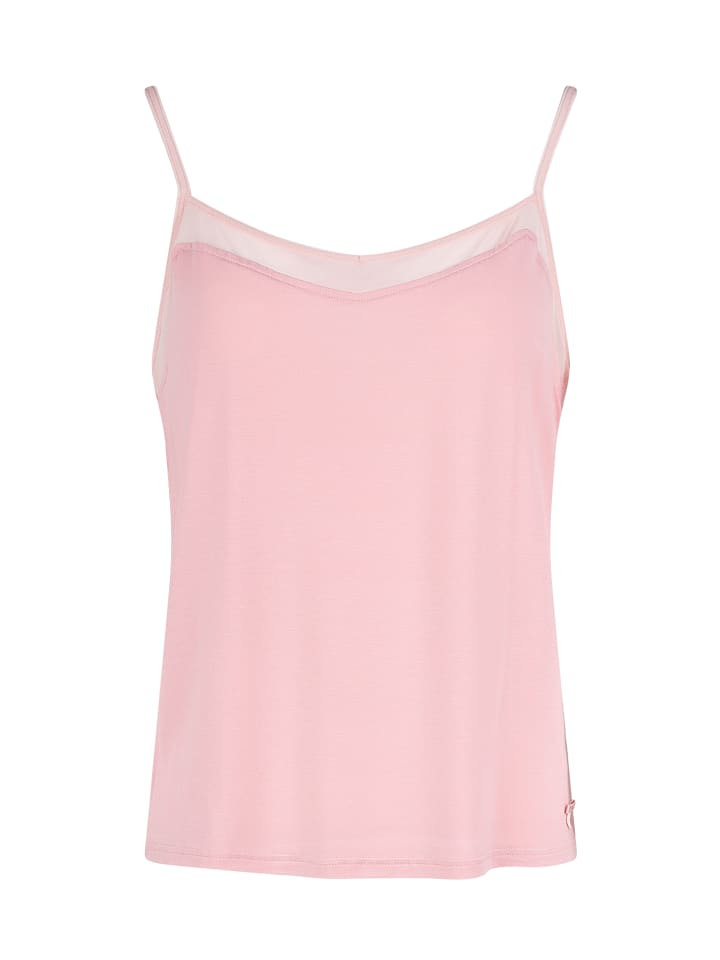 Этот универсальный топ с регулируемыми бретельками - просто необходимая вещь! Идеально подходит в качестве пижамы в сочетании с шортами для сна или как стильная майка. V-образный вырез украшен нежным прозрачным кружевом, добавляя нотку элегантности. Мягкая ткань обеспечивает исключительный комфорт, а изящные детали добавляют изюминку. Сочетайте функциональность со стилем и наслаждайтесь топом, который одновременно уютный и привлекательный. Изюминка любого гардероба.