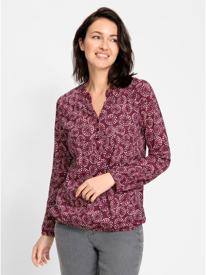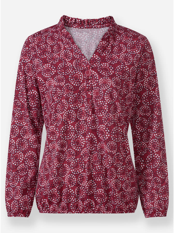 Гарантированно поднимет вам настроение: рубашка с принтом в веселый горошек из приятного мягкого микса материалов. Игривые оборки на комбинированном круглом и V-образном вырезе с короткой планкой на пуговицах. Пуговицы подобраны по цвету. Эластичные манжеты на длинных рукавах и подоле. Сертификация OCS