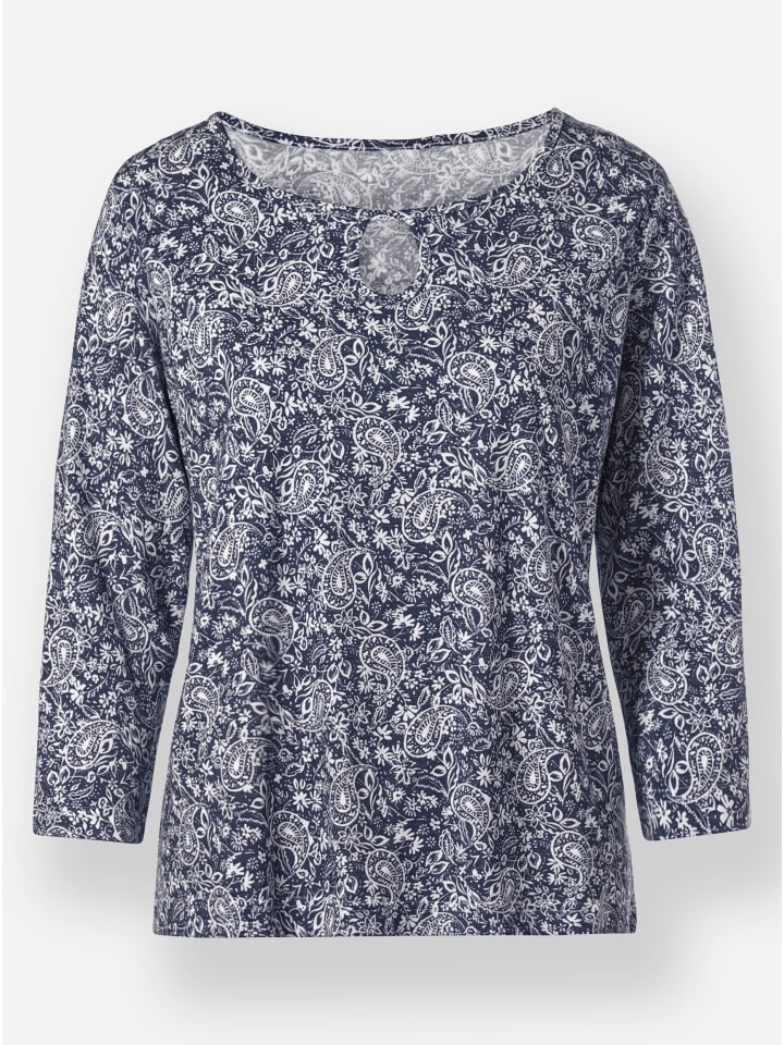 Эта рубашка с красивым принтом выполнена из удивительно мягкого смесового материала. Круглый вырез горловины декорирован окантовкой. Модные рукава 3/4.